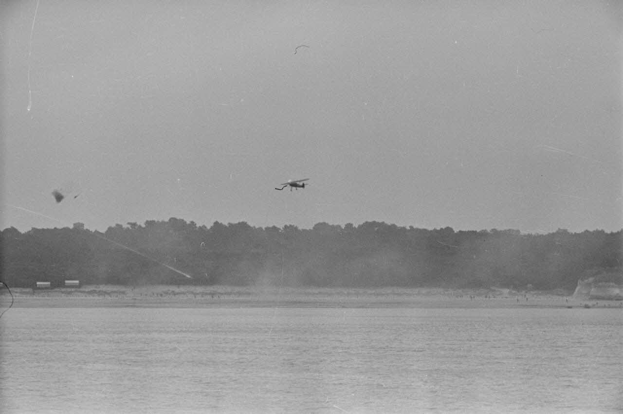 Un avion de reconnaissance Henschel Hs-126 au-dessus d'une plage qui fait l'objet d'un débarquement, un fumigène semble avoir été lancée depuis l'avion.