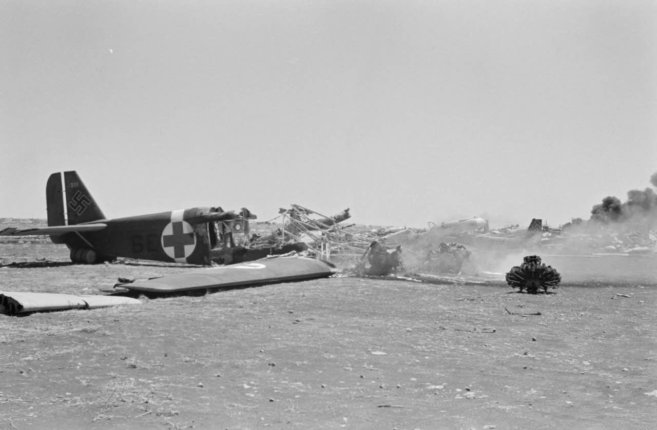 Note : le 29 juin 1942, Benito Mussolini s’envole pour l’Afrique en compagnie de 50 personnes, membres de son état-major. L’avion atterri à Castel Benito (au sud de Tripoli) où Mussolini et sa suite sont conduits vers le gouverneur de Libye. La prise de la ville de Matruh par les troupes de l’Axe permet à Mussolini de prolonger son vol vers Derna (El Fetejah) où ses maréchaux et officiers supérieurs l’attendent, notamment Bastico et Cavallero. Le général allemand Enno von Rintelen, attaché militaire allemand à Rome, est également présent. Après une conférence animée par le général Curio Barbasetti di Brun, Mussolini rejoint Berta pour rejoindre Tobrouk le lendemain. Mais une tempête de sable cloue au sol Mussolini et sa suite. Une visite d’un hôpital militaire de l’Axe et d’un camp de prisonniers (6 000 soldats britanniques) est planifiée en remplacement.
