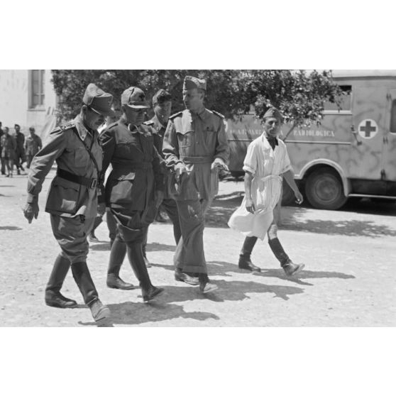 Note : le 29 juin 1942, Benito Mussolini s’envole pour l’Afrique en compagnie de 50 personnes, membres de son état-major. L’avion atterri à Castel Benito (au sud de Tripoli) où Mussolini et sa suite sont conduits vers le gouverneur de Libye. La prise de la ville de Matruh par les troupes de l’Axe permet à Mussolini de prolonger son vol vers Derna (El Fetejah) où ses maréchaux et officiers supérieurs l’attendent, notamment Bastico et Cavallero. Le général allemand Enno von Rintelen, attaché militaire allemand à Rome, est également présent. Après une conférence animée par le général Curio Barbasetti di Brun, Mussolini rejoint Berta pour rejoindre Tobrouk le lendemain. Mais une tempête de sable cloue au sol Mussolini et sa suite. Une visite d’un hôpital militaire de l’Axe et d’un camp de prisonniers (6 000 soldats britanniques) est planifiée en remplacement.