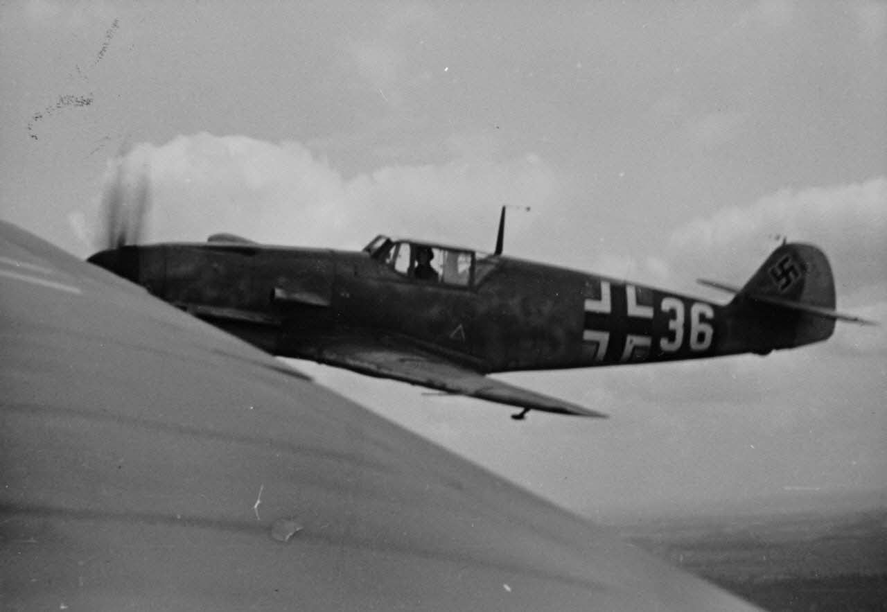 Grâce au vol en formation serrée, l'un des pilotes photographie son ailier aux commandes du Messerschmitt Me-109 (codé 36).