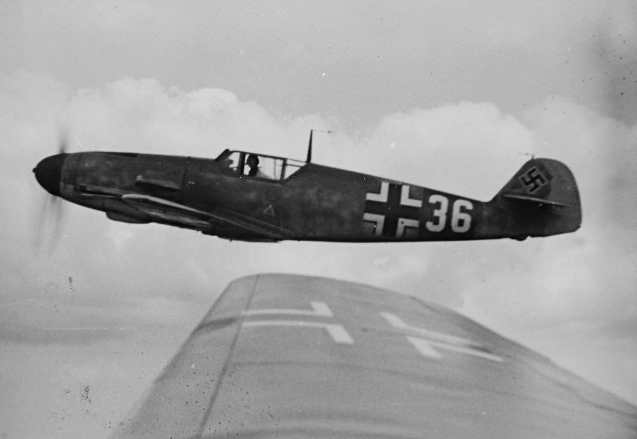 Grâce au vol en formation serrée, l'un des pilotes photographie son ailier aux commandes du Messerschmitt Me-109 (codé 36).