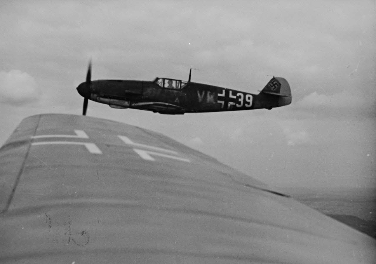 Grâce au vol en formation serrée, l'un des pilotes photographie son ailier aux commandes du Messerschmitt Me-109 (codé 36).