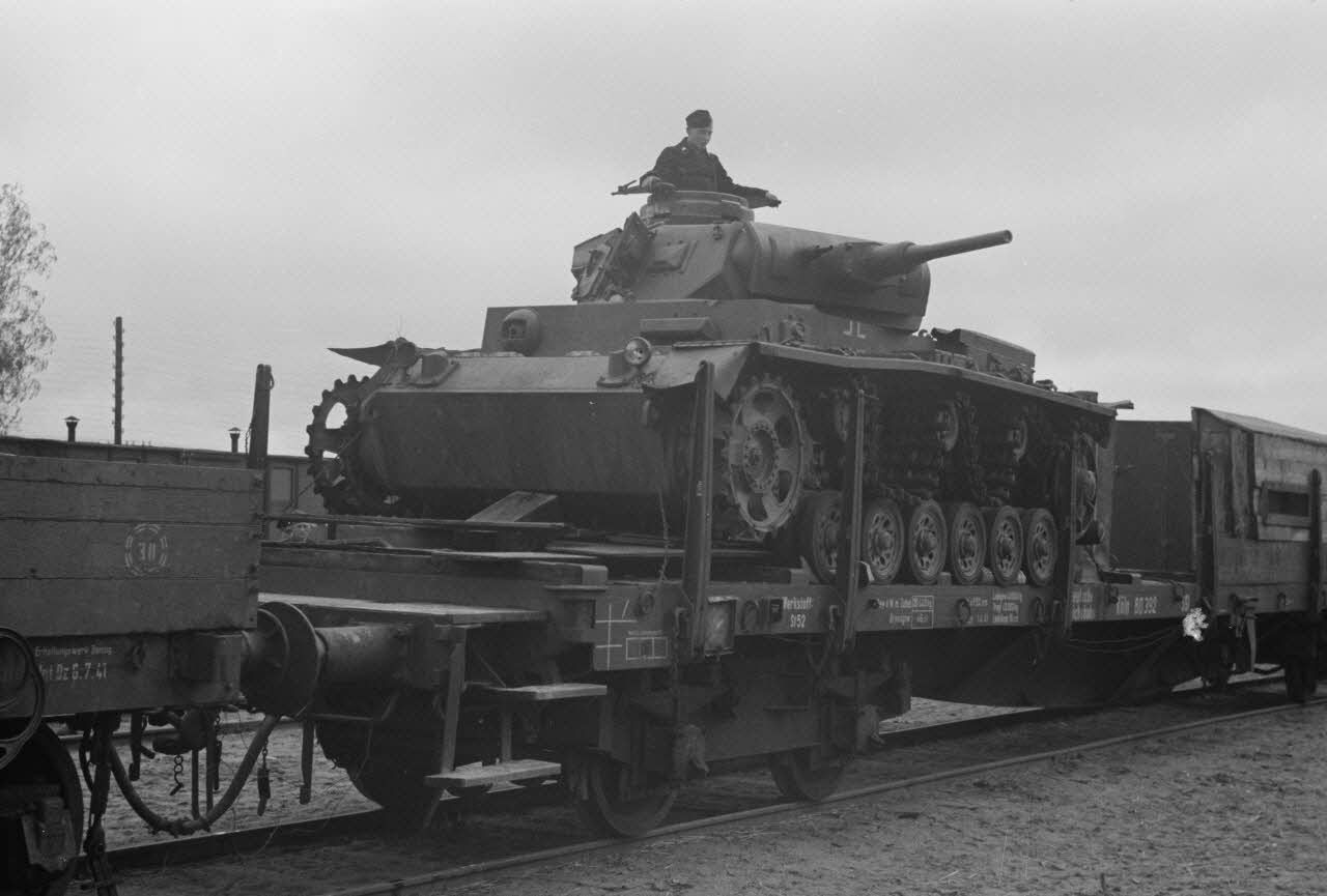 Un blindé allemand Panzer-III dépourvu de chenilles installé sur un wagon.