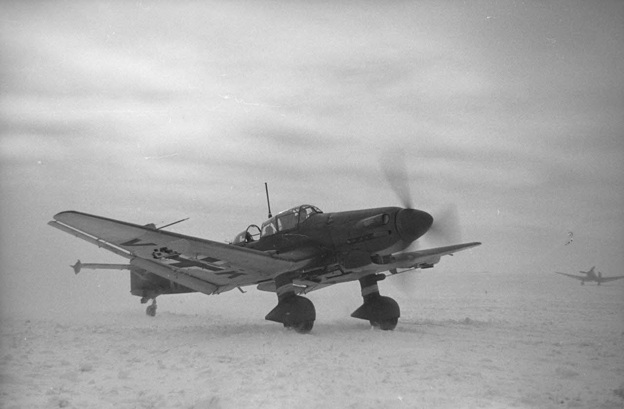 Un bombardier Junkers Ju-87 Stuka du Sturzkampfgeschwader 2 "Immelmann" sur le point de décoller sur un terrain d'aviation enneigé.