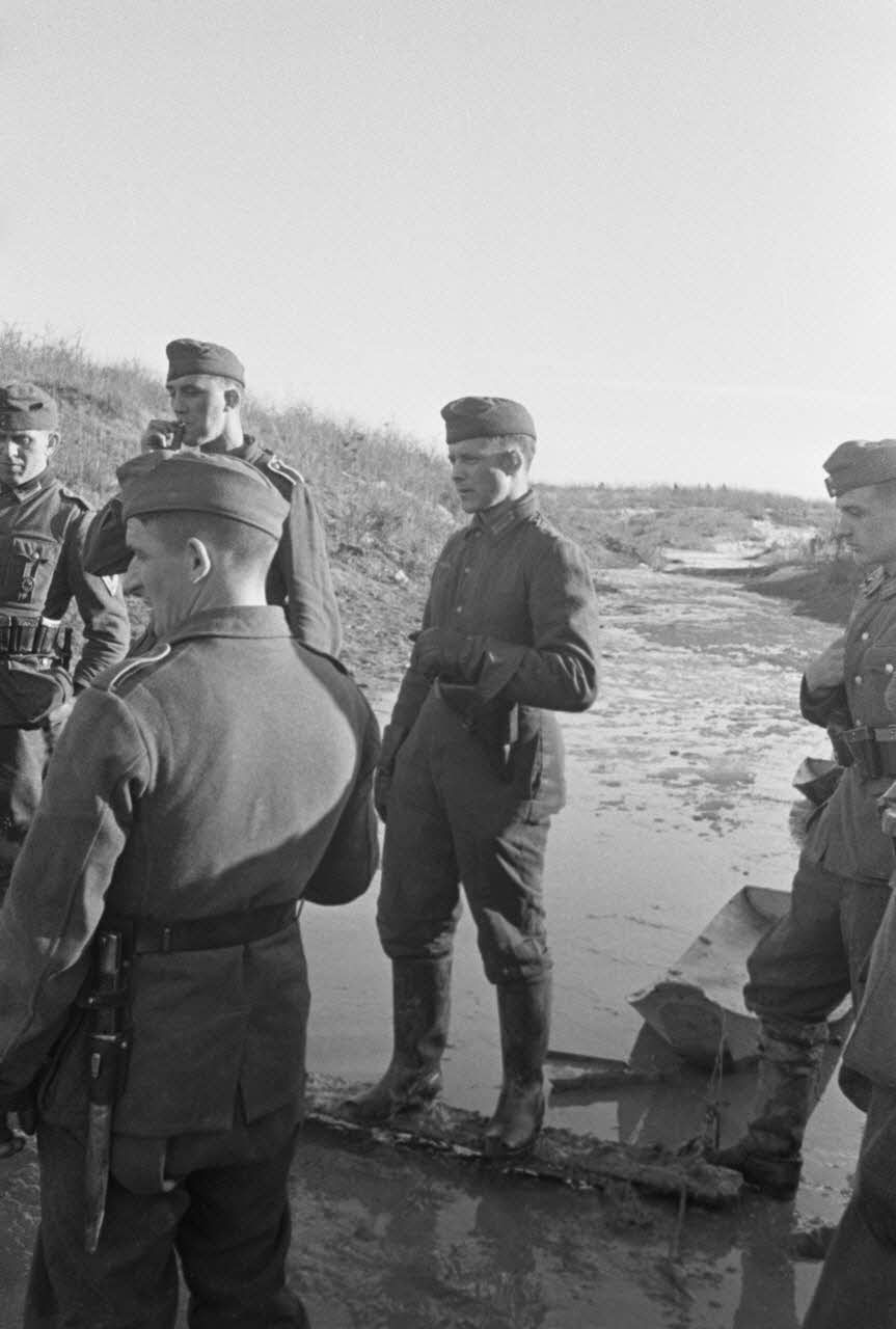 Un briefing de fantassins avant le départ d'une patrouille chargée de récupérer les corps de soldats allemands.
