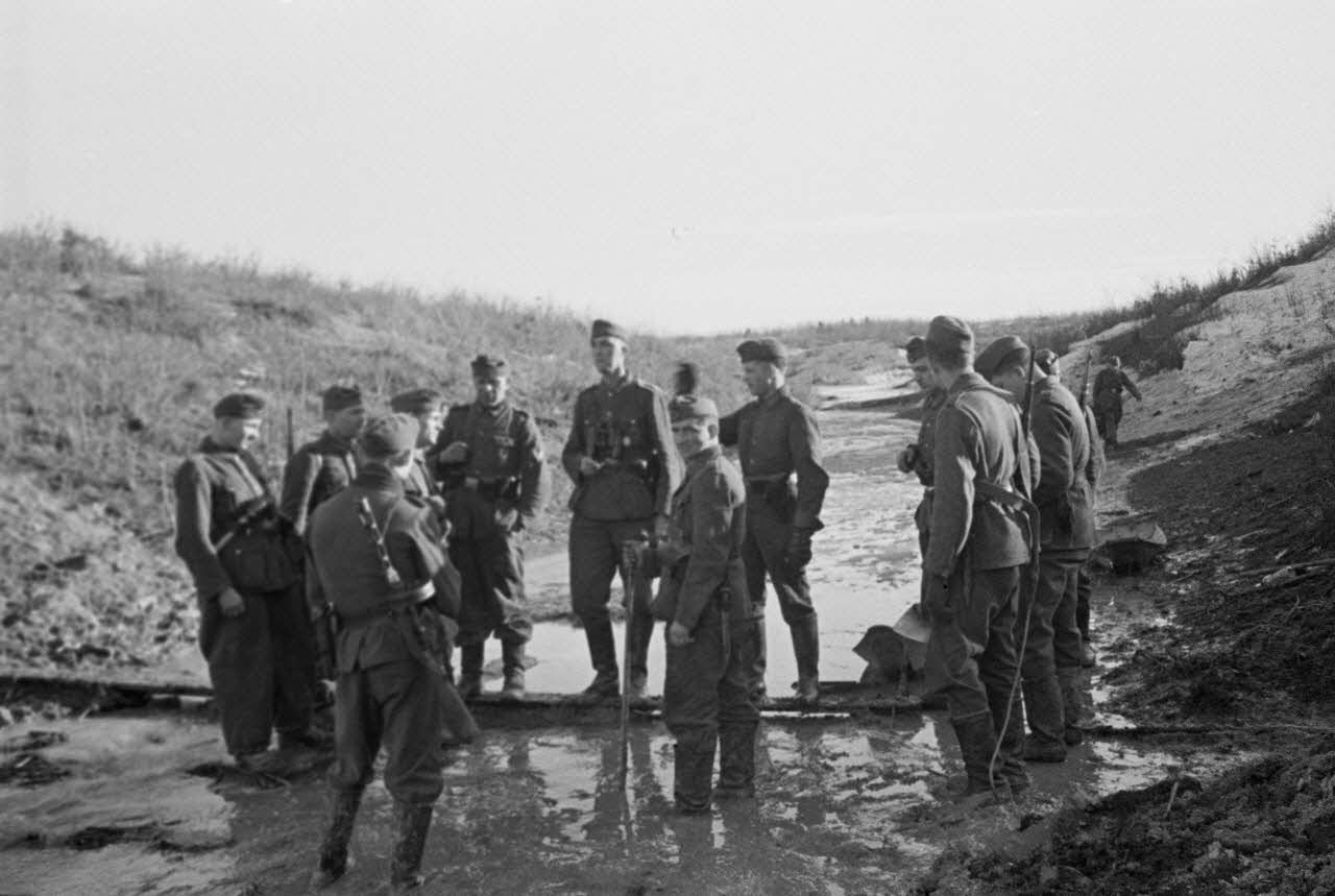 Un briefing de fantassins avant le départ d'une patrouille chargée de récupérer les corps de soldats allemands.