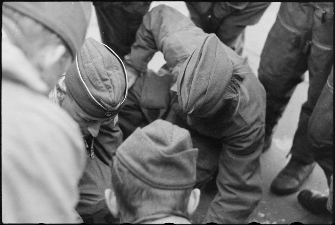 En Norvège, sur le terrain de Banak où stationne le 8./LLG 1 (Lulftlandegeschwader 1), un adjudant-chef (Oberfeldwebel) donne le signal du décollage des avions.