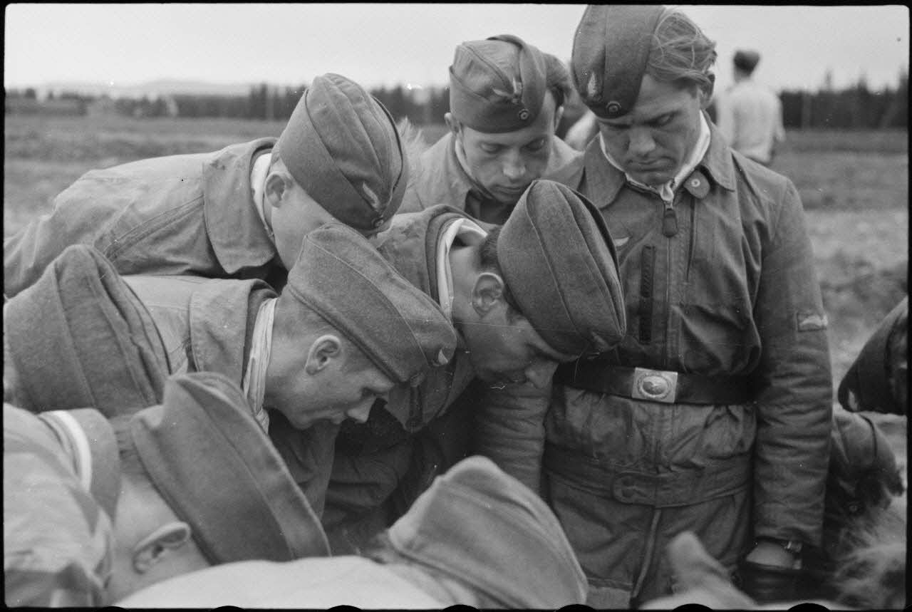 Des pilotes de Junkers Ju-87 Stuka et des équipages de planeurs du 8./LLG 1 (Lulftlandegeschwader 1) peu avant une manoeuvre depuis le terrain d'aviation de Banak.