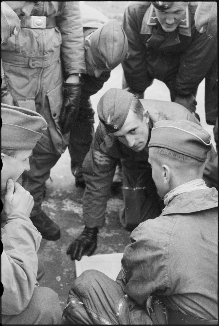 Des pilotes de Junkers Ju-87 Stuka et des équipages de planeurs du 8./LLG 1 (Lulftlandegeschwader 1) peu avant une manoeuvre depuis le terrain d'aviation de Banak.