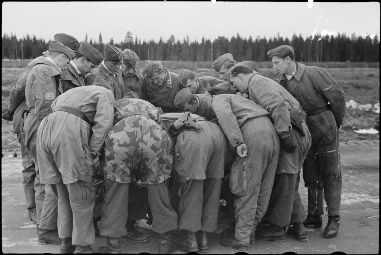 Des pilotes de Junkers Ju-87 Stuka et des équipages de planeurs du 8./LLG 1 (Lulftlandegeschwader 1) peu avant une manoeuvre depuis le terrain d'aviation de Banak.