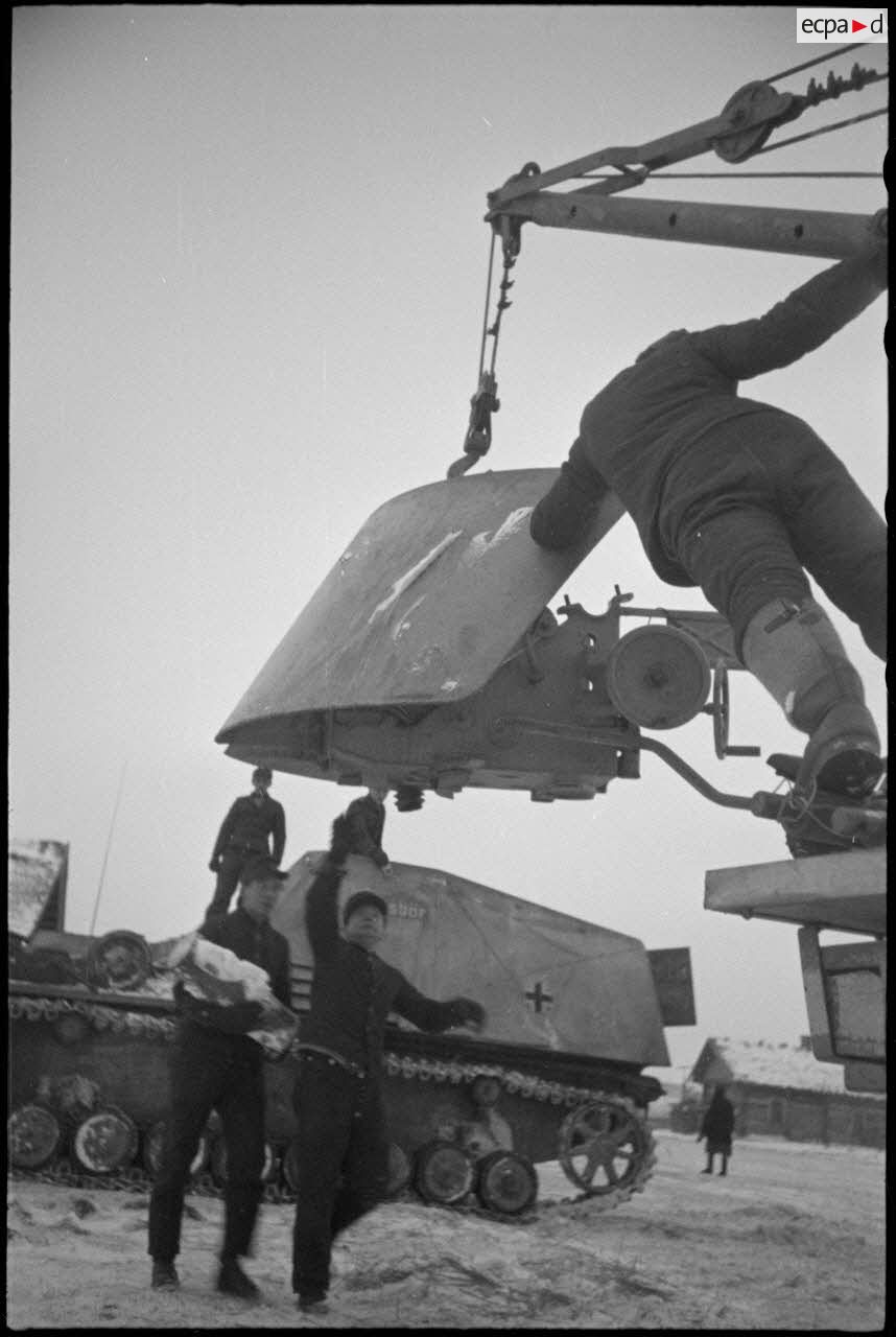 Un camion grue Mercedes-Benz Typ L 4500 S ou Büssing-NAG 4500 A permettent le changement du canon de 8,8 Pak 43/41 du Nashorn baptisé "Eisbär". Après le canon, c'est le bouclier qui est hissé par la grue à bord du canon automoteur. A l'abri d'un hangar, des mécaniciens d'une Werkstatt Kompanie effectuent la maintenance du moteur.