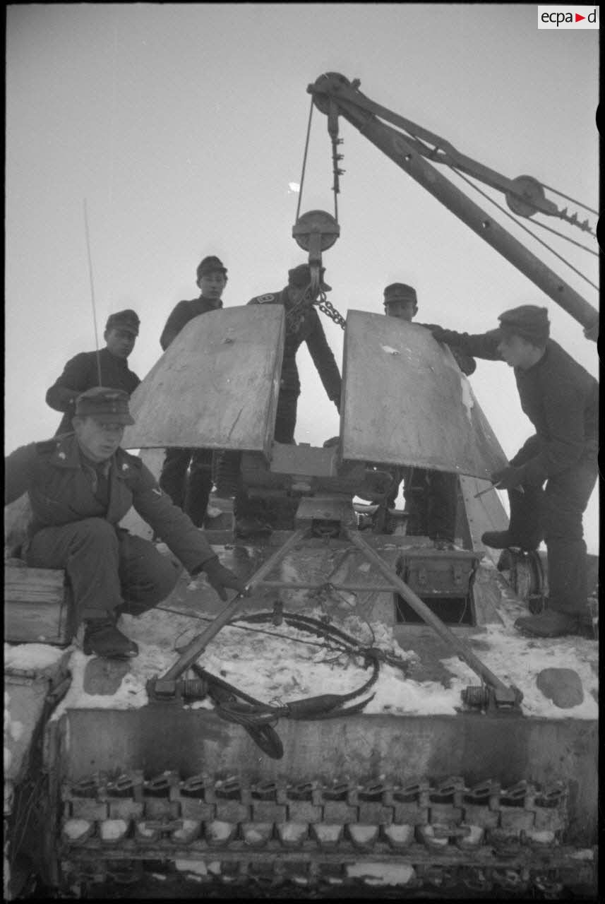 Un camion grue Mercedes-Benz Typ L 4500 S ou Büssing-NAG 4500 A permettent le changement du canon de 8,8 Pak 43/41 du Nashorn baptisé "Eisbär". Après le canon, c'est le bouclier qui est hissé par la grue à bord du canon automoteur. A l'abri d'un hangar, des mécaniciens d'une Werkstatt Kompanie effectuent la maintenance du moteur.