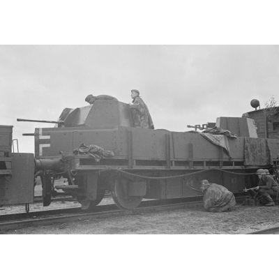 Le canon d'une mitrailleuse MG-34 dépassant d'un wagon du train blindé.