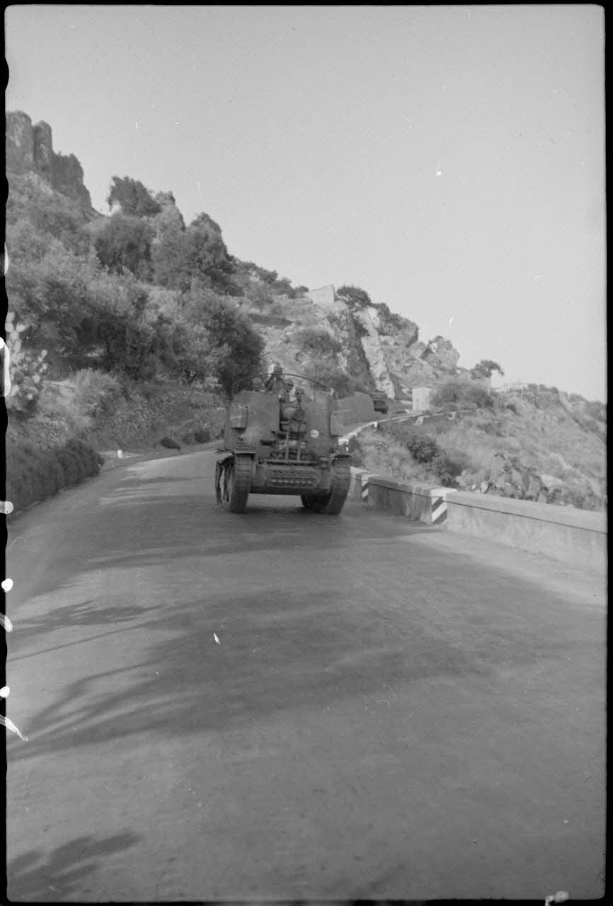 Dans le secteur de Taormina, la progression de blindés de la 9.Infanteriegeschützkompanie de la Panzer-Grenadier-Regiment Hermann Goering.