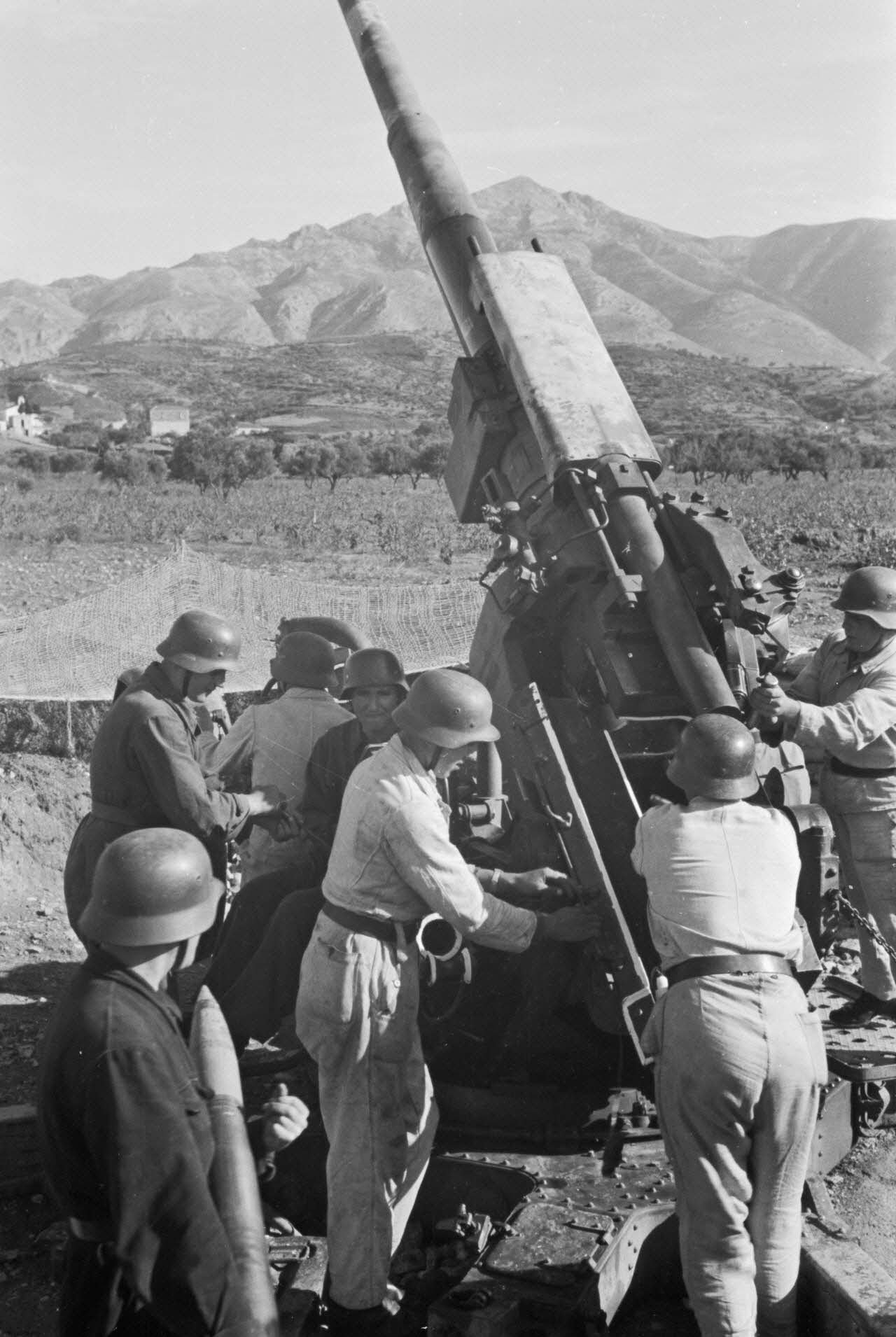Batterie de défense antiaérienne (FlaK) protégeant le terrain d'aviation. Suite à la capture de la Crète, les Allemands mettent la main sur de nombreux canons britanniques dont ces Mark III A de 3,7 pouces (9,4 cm) qui'ls réutilisent pour la protection antiaérienne du terrain d'aviation occupé par le Aufklärungsgruppe 123.