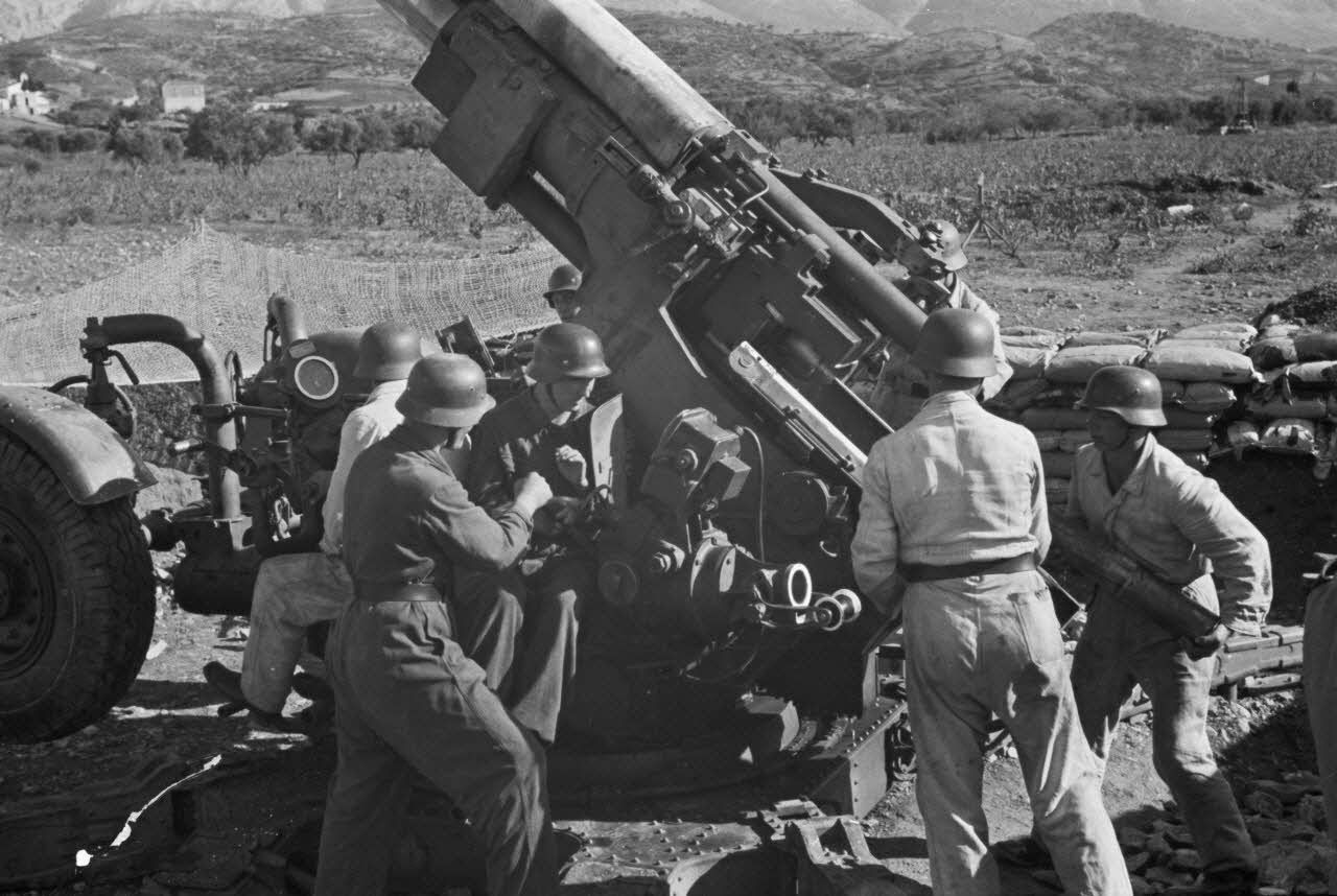 Batterie de défense antiaérienne (FlaK) protégeant le terrain d'aviation. Suite à la capture de la Crète, les Allemands mettent la main sur de nombreux canons britanniques dont ces Mark III A de 3,7 pouces (9,4 cm) qui'ls réutilisent pour la protection antiaérienne du terrain d'aviation occupé par le Aufklärungsgruppe 123.