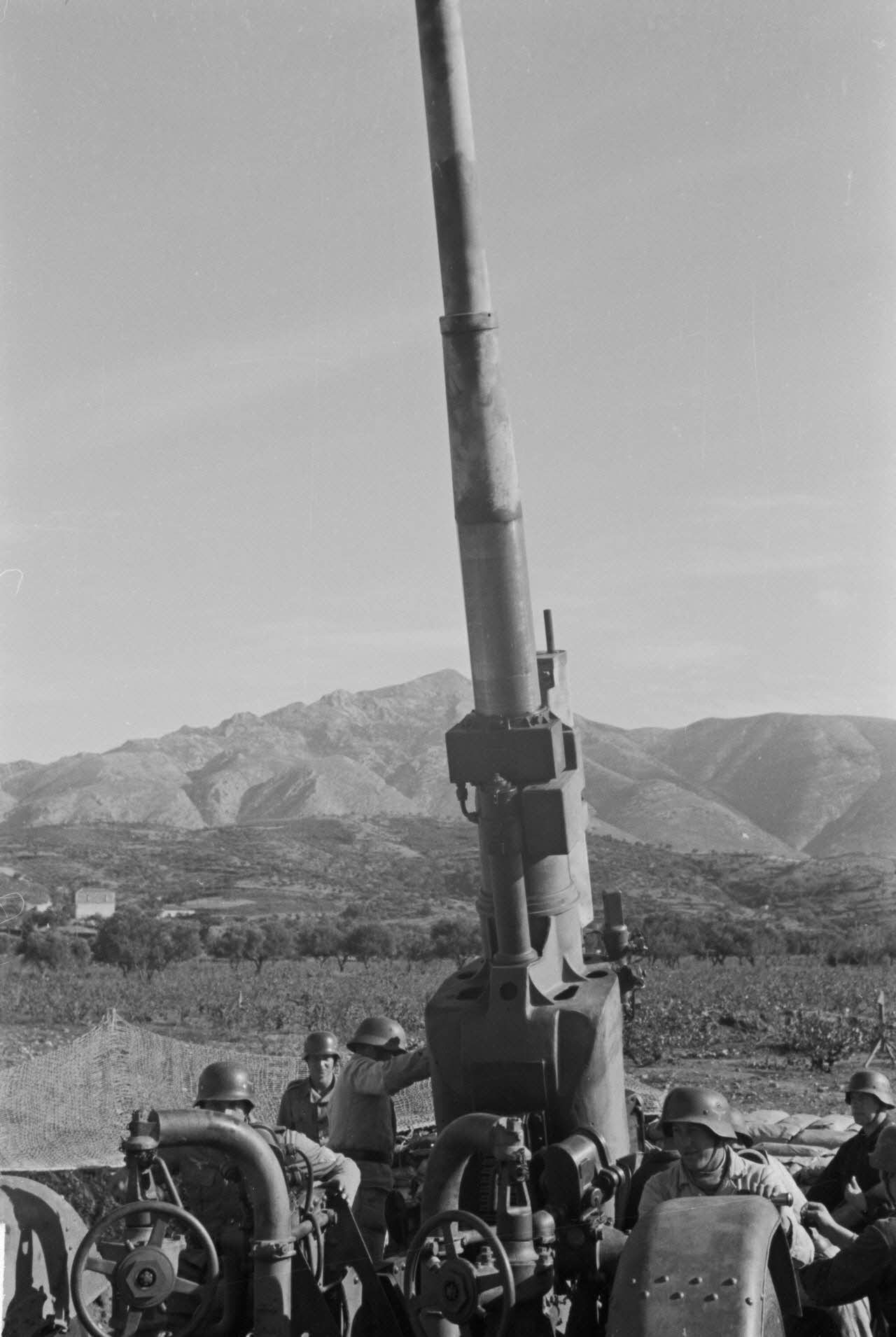 Batterie de défense antiaérienne (FlaK) protégeant le terrain d'aviation. Suite à la capture de la Crète, les Allemands mettent la main sur de nombreux canons britanniques dont ces Mark III A de 3,7 pouces (9,4 cm) qui'ls réutilisent pour la protection antiaérienne du terrain d'aviation occupé par le Aufklärungsgruppe 123.