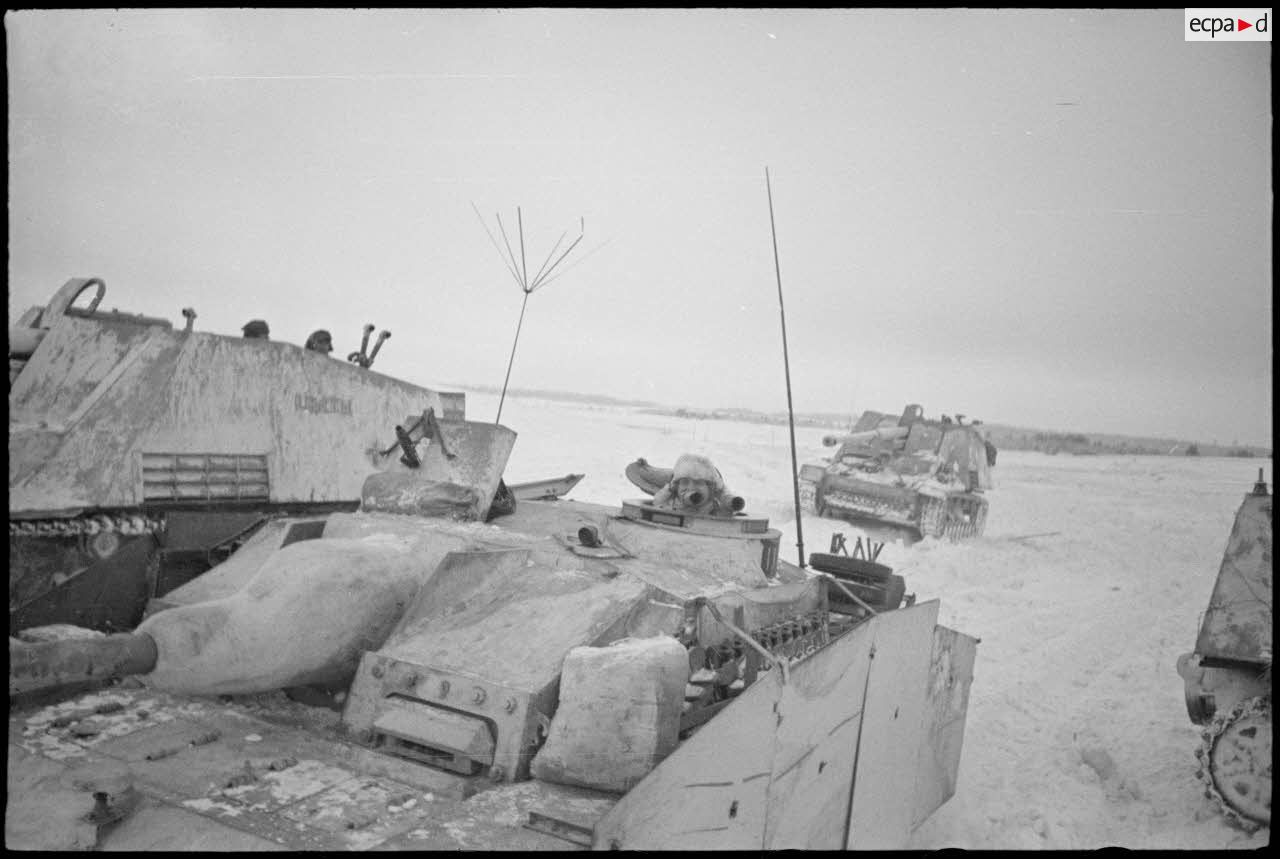 Des Panzergrenadiers blessés passent devant des véhicules de soutien du 1er escadron du schwere Panzerjäger-Abteilung 519.