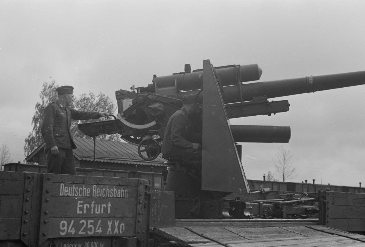 Un canon de 8,8 cm FlaK installé sur un wagon.