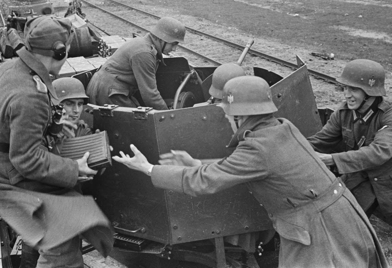 Un canon de DCA de 2 cm FlaK 38 (Flugabwehrkanone) installé sur un wagon.