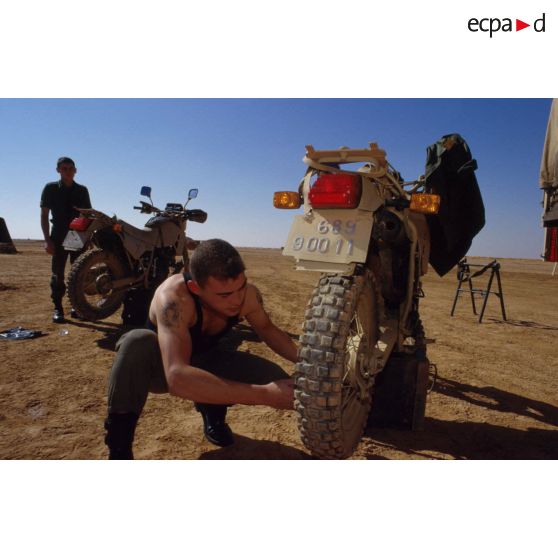 Réparation d'une moto Cagiva 350 cm3 du 7e RPCS (régiment parachutiste de commandement et de soutien).