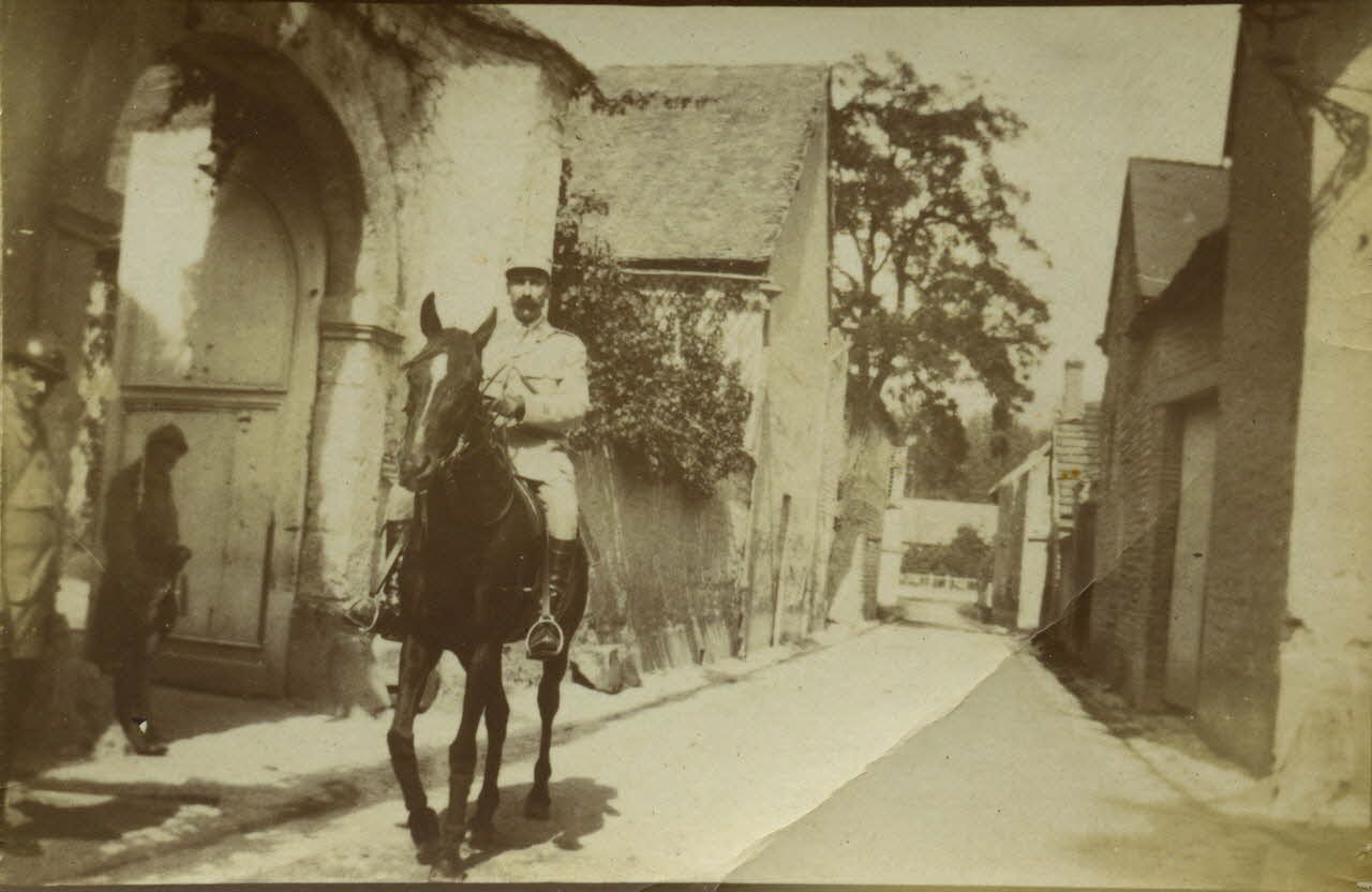 Colonel Desbareau à cheval sortant de son P.C. à Levignen. Nouveau colonel depuis le 26 mai 1917.