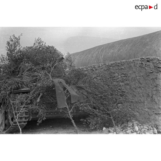 Un char Panzer III (Pz-III Ausf-L) est camouflé sous des branchages près d'une habitation de pierre.