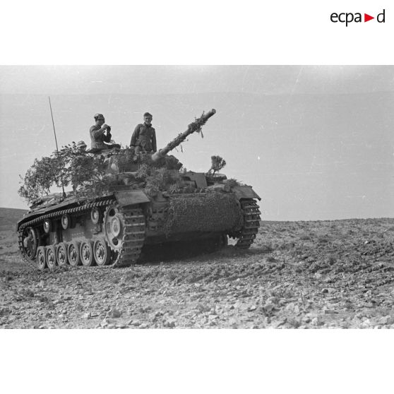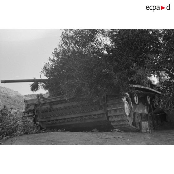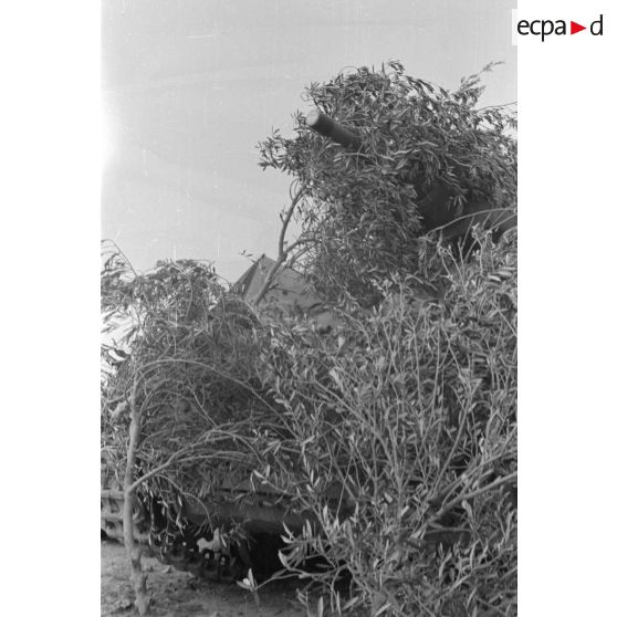 Un char Panzer III (Pz-III Ausf-L) camouflé sous un arbuste.