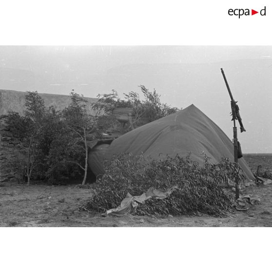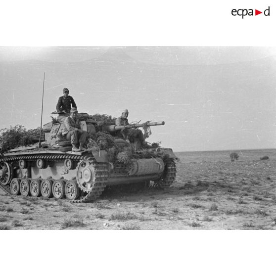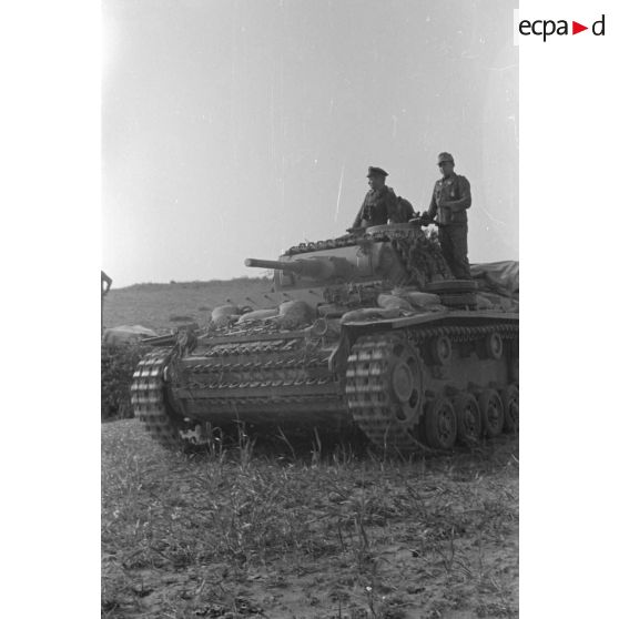 Un char Panzer III (Pz-III Ausf-L) camouflé sous des branchages et la tente de l'équipage, une des trois mitrailleuses MG-34 est positionnée en défense antiaérienne près de la tente.