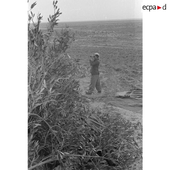 Un membre de l'équipage du char Panzer III observe le terrain à la jumelle.