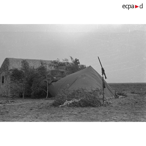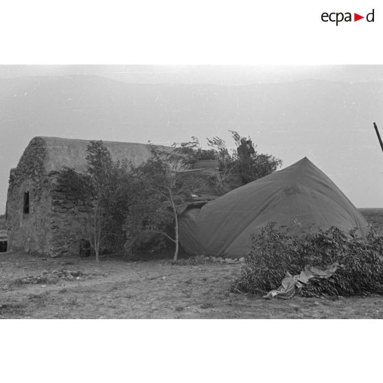 Tente de l'équipage d'un char Panzer III (Pz-III Ausf-L) appuyé contre le mur d'une habitation.