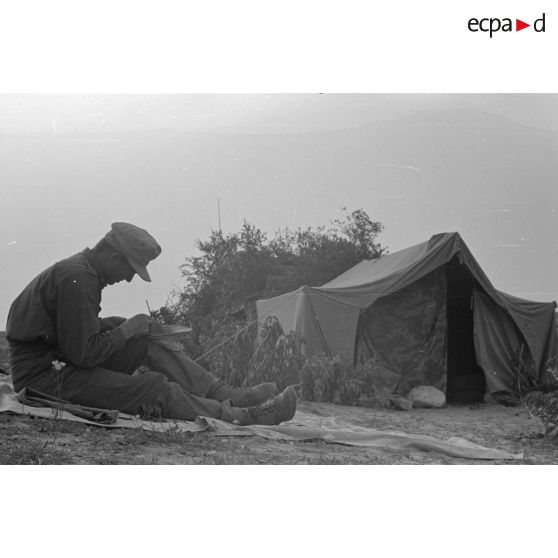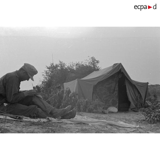 Un membre d'équipage d'un blindé Panzer III (non visible) fait des travaux de réparation près de sa tente en partie camouflée.