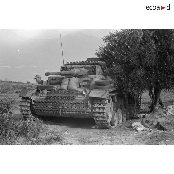 Un char Panzer III (Pz-III) camouflé entre des arbres, il s'agit d'un Pz-III Ausf-L.