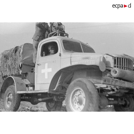 Deux soldats manoeuvrent un treuil installé sur un camion Dodge T215 d'origine américaine.