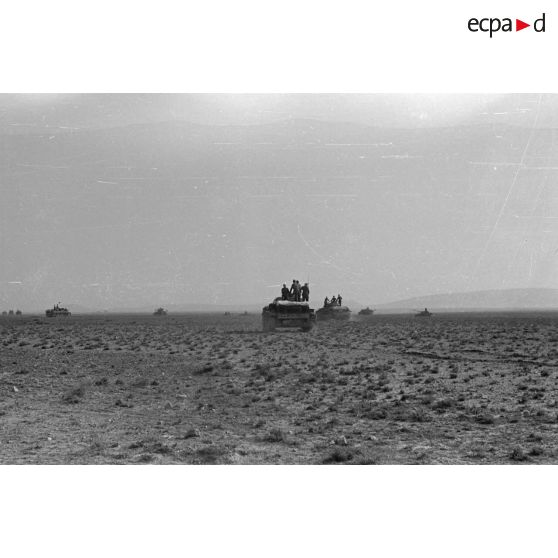 Une unité de chars manoeuvre dans une plaine puis, formée en colonne, passe une crête.