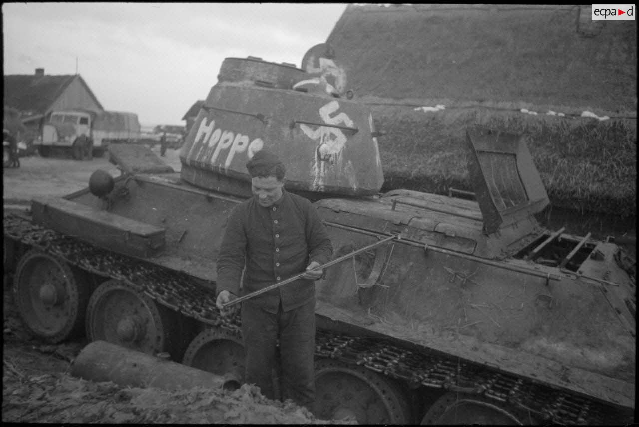 Un char russe T-34 capturé portant le nom du Major Hoppe commandant le schwere Panzerjäger-Abteilung 519.