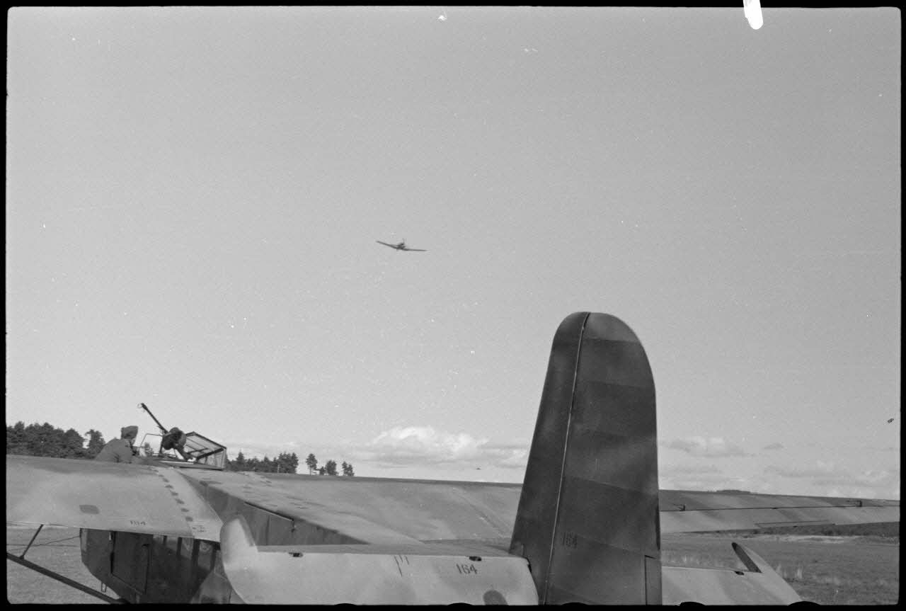 Enfin, deux chasseurs Messerschmitt Me-109 touchent le sol du terrain d'aviation. Ces avions constituaient peut-être l'escorte des remorqueurs durant l'exercice.