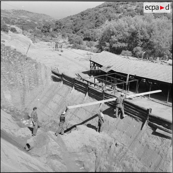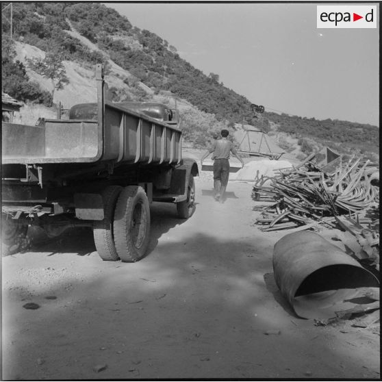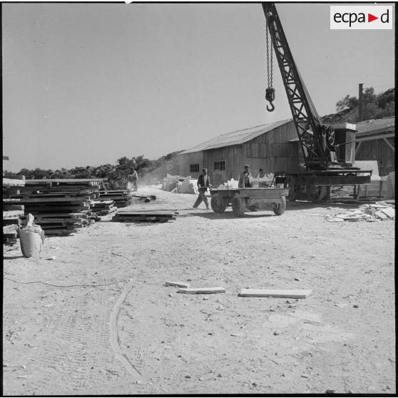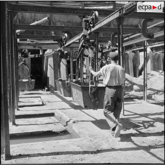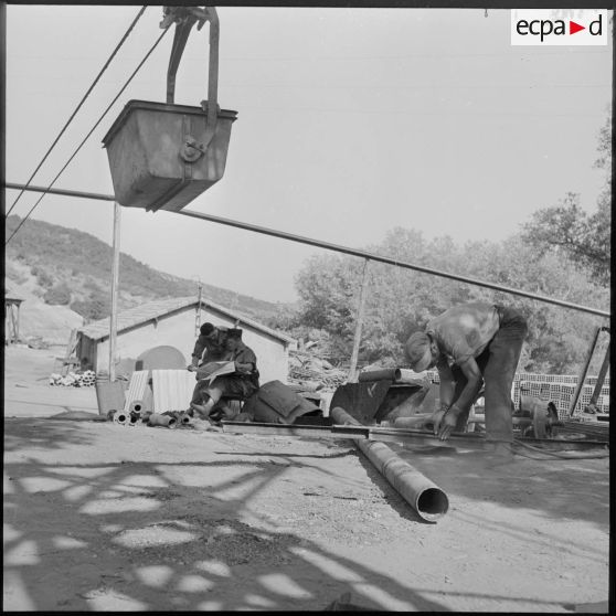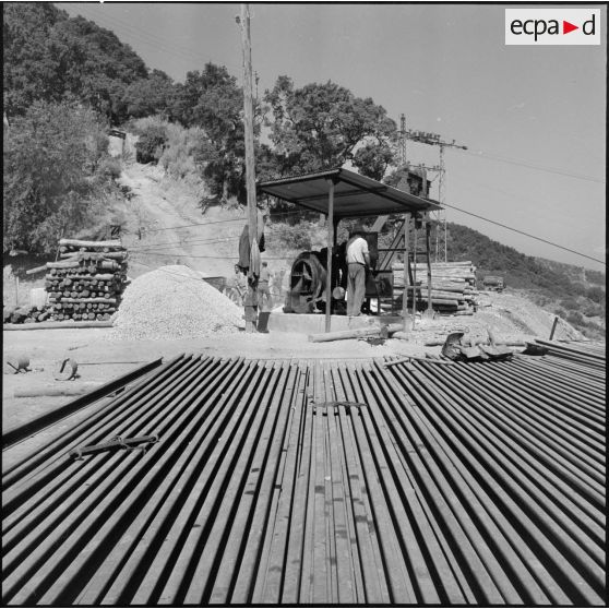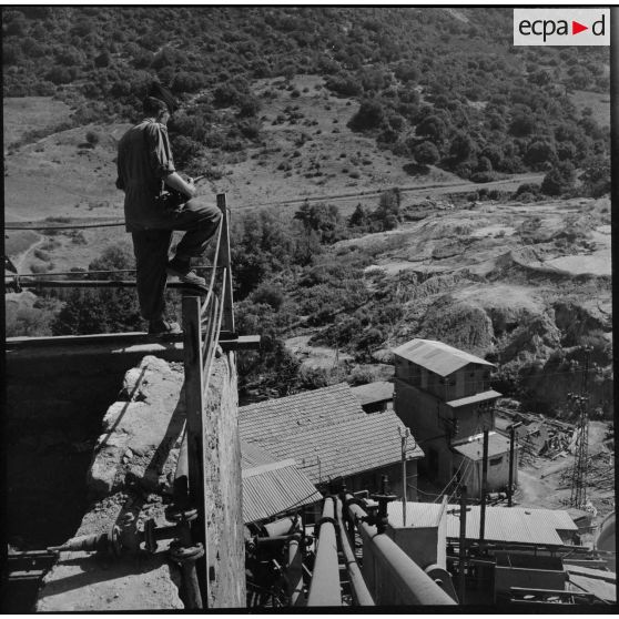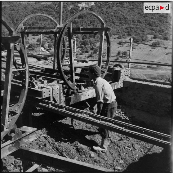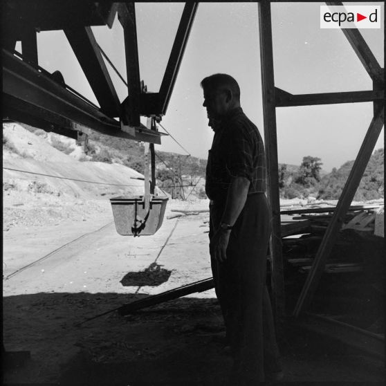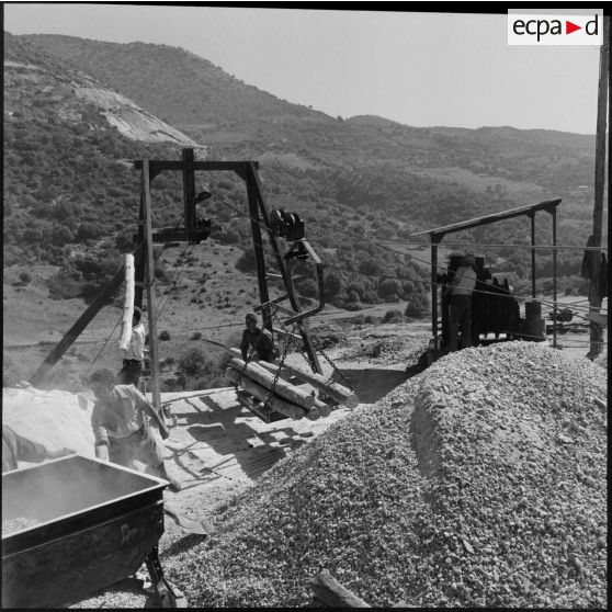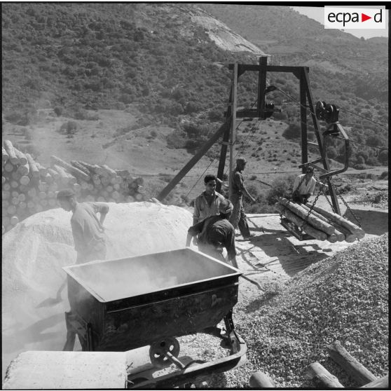 Acheminement par téléphérique des rondins de bois des galeries de la mine d'El Alia.