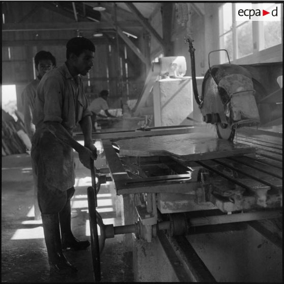 Un ouvrier de la carrière de Fil Fila découpe des plaques de marbre.