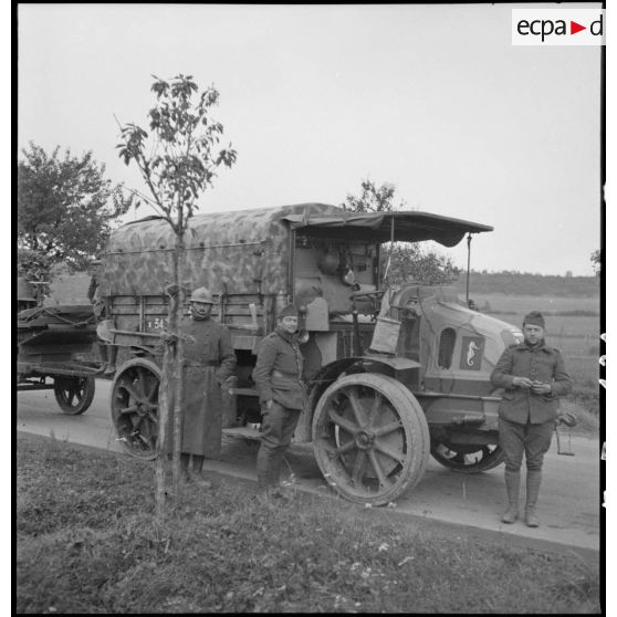 Un camion Latil TAR du 185e RA tracte un 145/155 mm M1916 sur une route.
