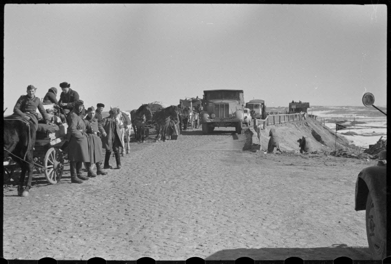 Un convoi hippomobile composé de fantassins allemands et de civils russes marque une pause après la traversée d'un pont.