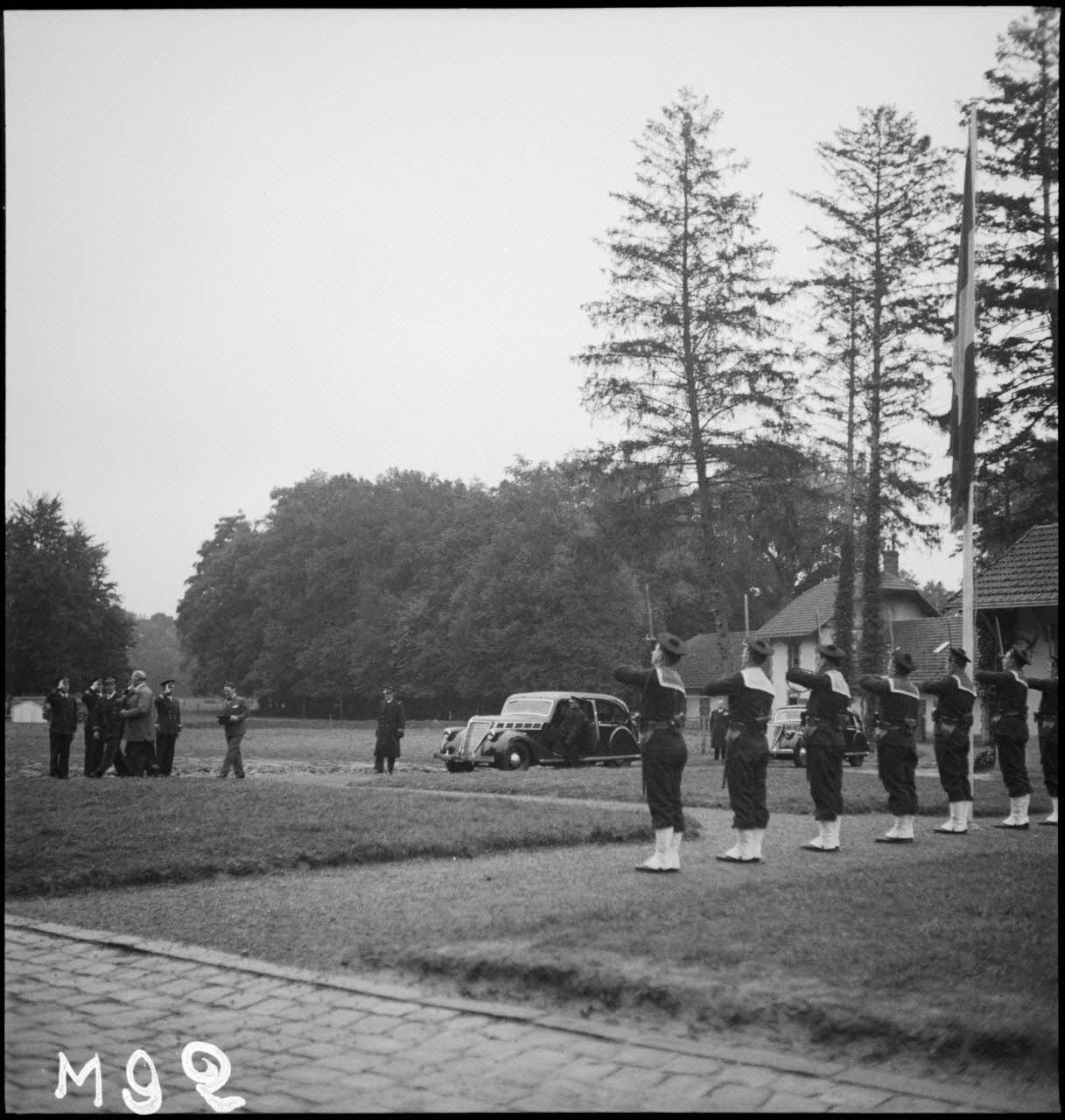 Un détachement de fusiliers marins rend les honneurs à l'arrivée du président de la République, Albert Lebrun, dans le camp d'entraînement.