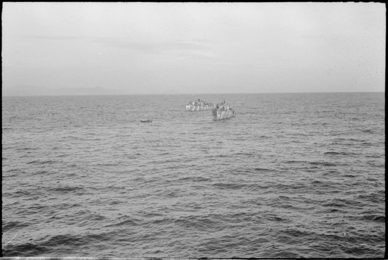 Sur l'île de Leros (Grèce), un bombardement aérien et les activités de dragueurs de mines allemands, peut-être la 12.Räumboot-Flottille de la Kriegsmarine.