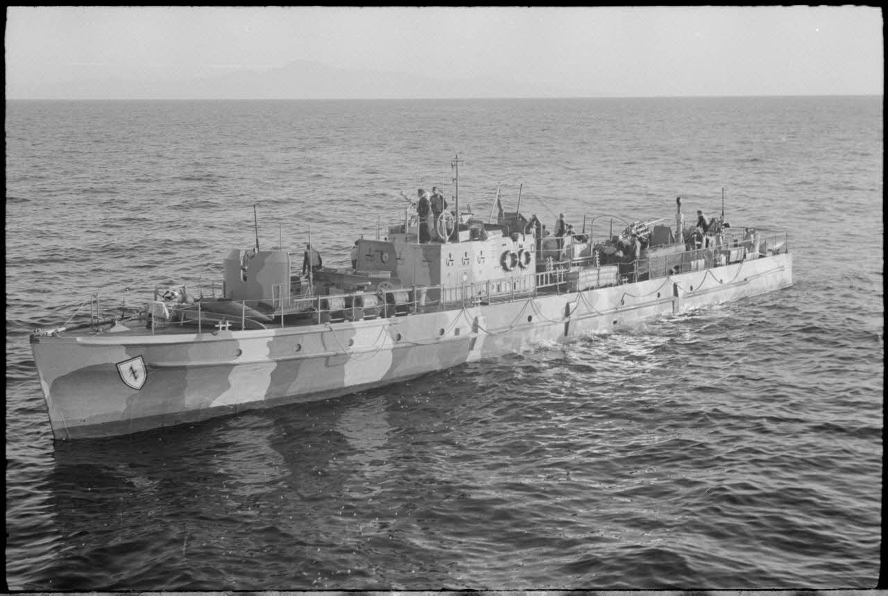 Un navire de surface de la 12.Räumbootsflottille, un insigne est visible sur la proue du bâtiment.