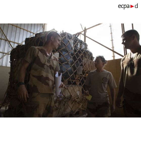 Des éléments du détachement de transit interarmées (DéTIA) placent des manifestes de chargement sur des caisses de matériels en zone logistique de Gao, au Mali.