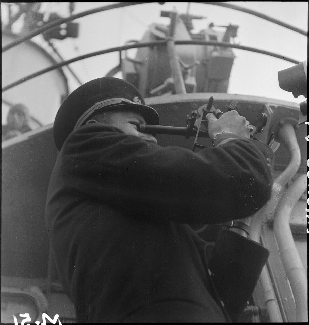 Un enseigne de vaisseau fait le point avec un sextant à bord du contre-torpilleur Le Malin.