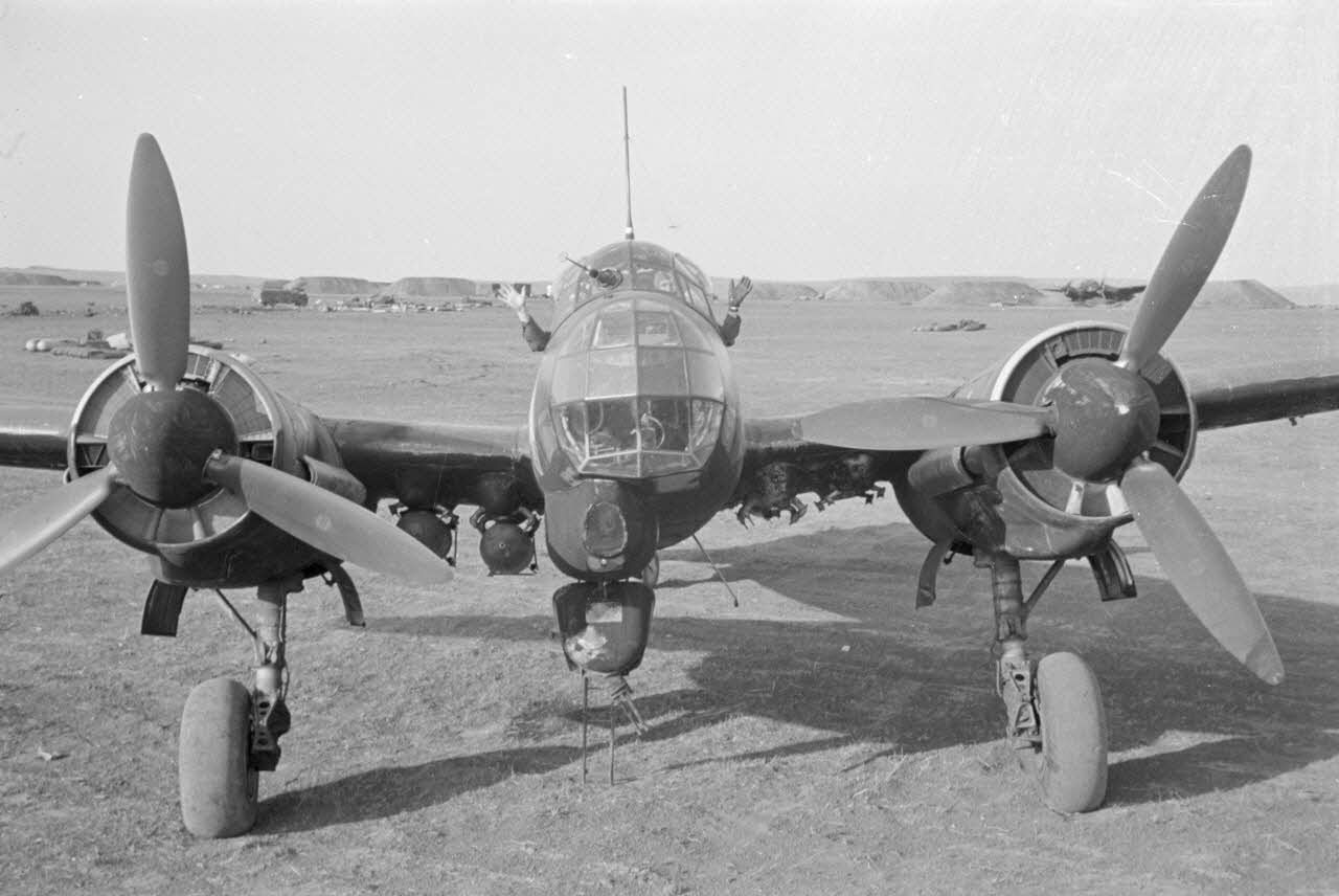 Le chasseur bimoteur Bf-110 codé 2N+GU du 10(N)ZG1 sur le terrain de Bagerevo.