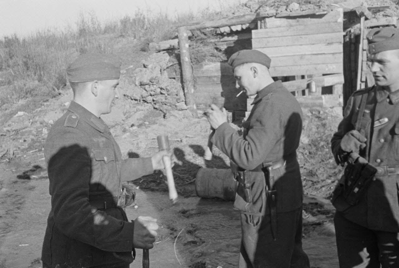 Un fantassin allemand fume peu avant le départ d'une patrouille, tandis qu'on lui tend une grenade à manche.