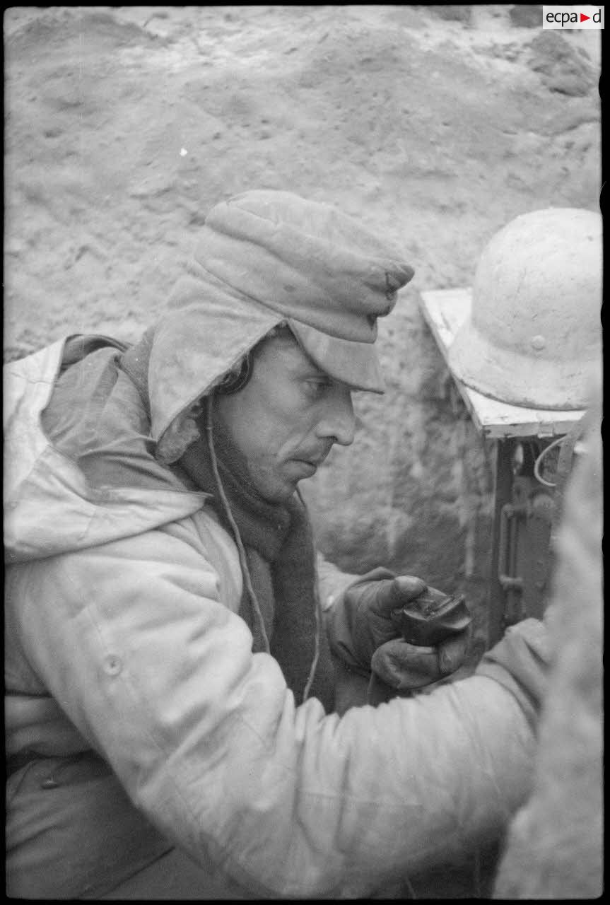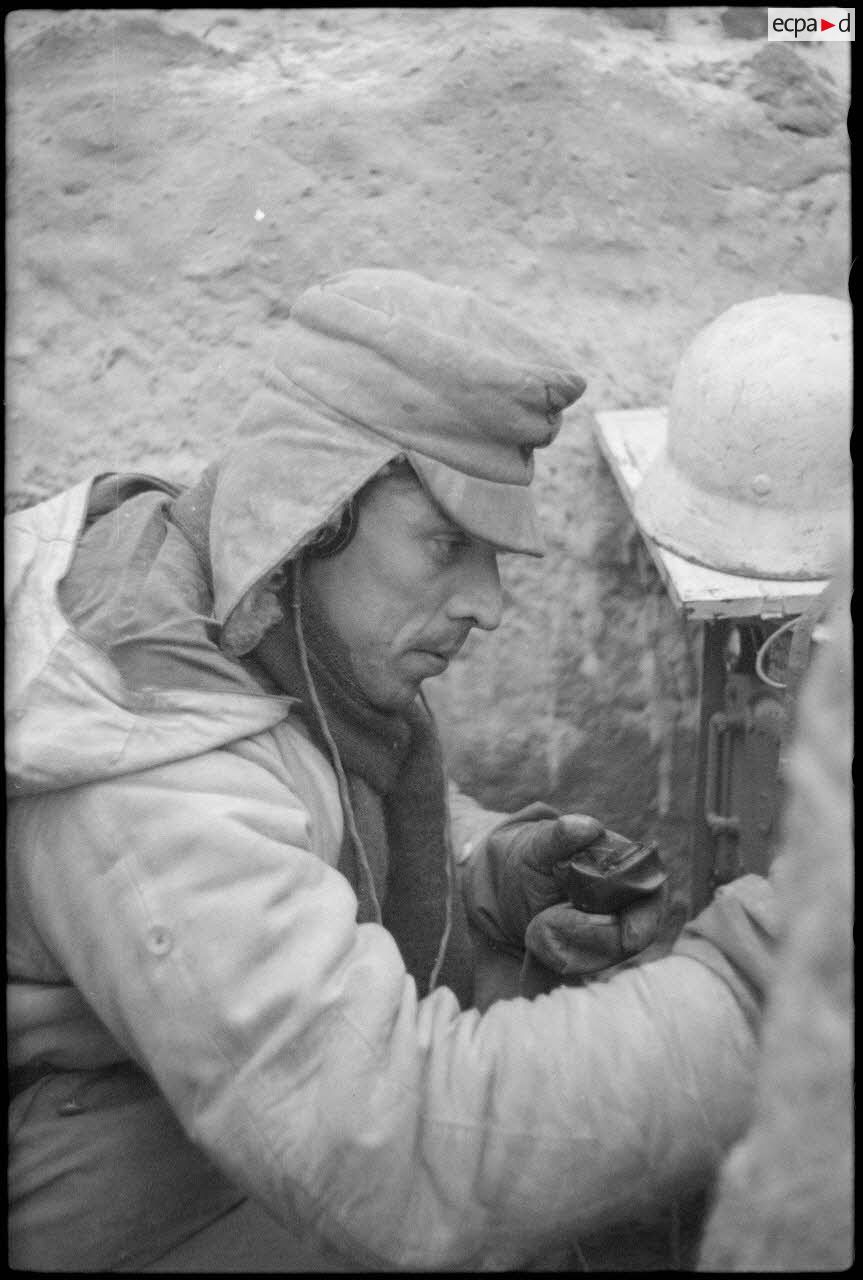 Un fantassin de l'armée de l'air allemande dans une tranchée, émet un message depuis d'un poste radio (tranmissions), ici il s'agit d'un Torn.Fu.d2.