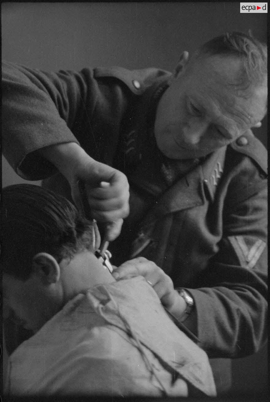 Un fantassin de la Luftwaffe coupe les cheveux d'un camarade.